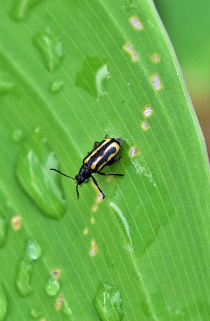 Flea beetles are tiny shiny beetles with really large rear legs. They only measure about ⅙” in size and can be either black, tan with stripes, or very colorful. Flea beetles get their “flea” name because they jump just like fleas.